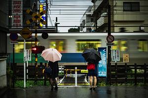Two women with umbrellas wait for a train to pass at a level crossing on a dark, rainy day in Tokyo.