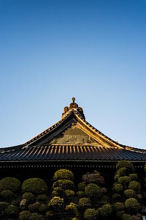 Afternoon sun and a temple roof at Gyokuzo-in, a Shingon Buddhist temple in Saitama City, Japan