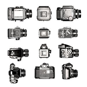 Four legendary cameras seen in three aspects each. Shown are a Mamiya RZ67, Hasselblad 500C/M, Mamiya 645 Pro, and a Pentax 67II. These cameras were all being used by professional photographers at the time and show signs of the working life. Perfect for your wall, whether you're a photographer or simply someone who can appreciate the design of these beautiful tools.