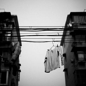 A shirt and a coat hanging to dry, inadvisably, on a power line some five meters off the ground. Photographed in my old neighborhood in Shanghai, China.