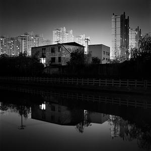 A study of old house by a canal in Shanghai, nearby more recent high-rise development.