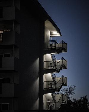 Study of an old danchi-style apartment building at dusk, Nishi Ward, Saitama City, Japan