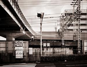A train line sandwiched between surface and elevated roads in Osaka.